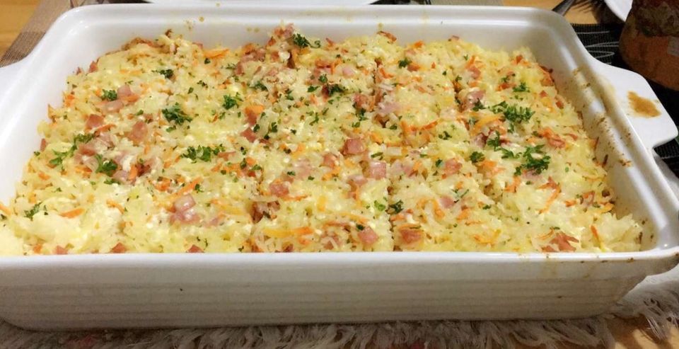 Mezclar los ingredientes (arroz, jamón, zanahoria, perejil y mozzarella) en un bol. Untar una fuente apta para horno con margarina. Es recomendable que sea una de cristal. Batir los huevos junto con la sal, pimienta, queso parmesano, requesón y leche. Puedes hacerlo con la batidora o licuadora. Ponerlo en la fuente, primero la mezcla con el arroz y luego la batida. Meterlo al horno precalentado a 200°C durante unos 30 minutos o cuando veas que comienza a dorarse la capa superior.