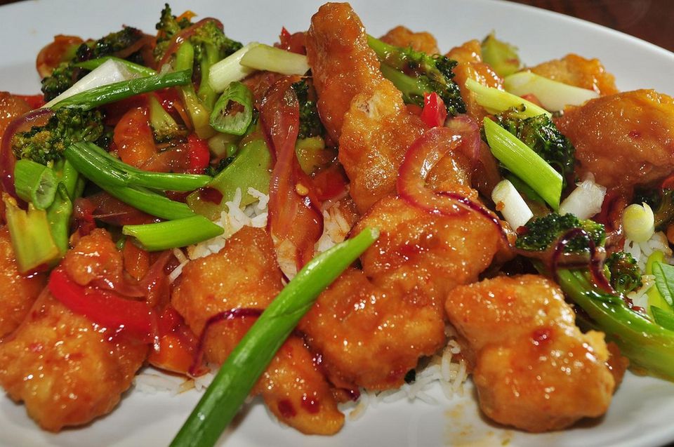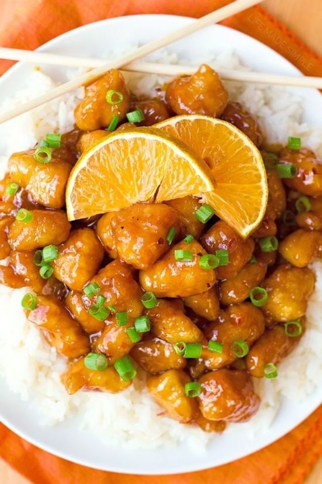 En un recipiente hondo mezcle el jugo de naranja y la maicena hasta que la maicena se haya disuelto. Agregue la cáscara de naranja, el jengibre, la salsa soya y el chile rojo y mezcle bien. Caliente un sartén grande o si tiene un wok. Agregue el aceite y dore la cebolla y el ajo por 2 minutos. Sazone el pollo con sal y pimienta y agregue al wok cocinando hasta que el pollo esté bien cocido y la cebolla dorada y crujiente. Agregue las verduras y la salsa de naranja, mezcle y continue cocinando por aproximadamente 3 minutos o hasta que la salsa se haya espesado. Retire del fuego y sirva. Sirva el pollo sobre una cama de arroz blanco. Le puede agregar más salsa de naranja si le gusta con un sabor más intenso.