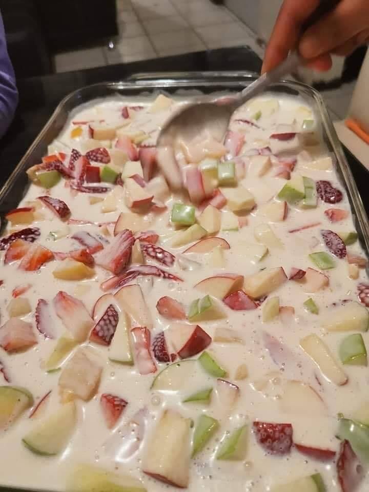 Para el postre de frutas: Los 3 ingredientes se cortan en pedazos no muy pequeños. Para la crema: Todo se licúa. Agregas las frutas y vacías la crema y listo refrigeras para q este fresco si quieres puedes agregar nuez o fruta de la que desees.