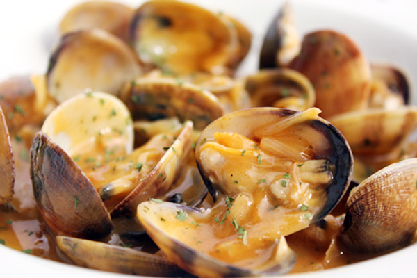 Lavar bien las almejas, dejarlas un rato en agua y sal par que suelten la arena. En una cazuela rehogar la cebolla picada, anadir los tomates rallados, sal y pimentón. Remover y anadir las almejas, el vino blanco, el perejil y la pimienta. Cocer a fuego vivo para que las almejas se abran. Servir en la misma cazuela.