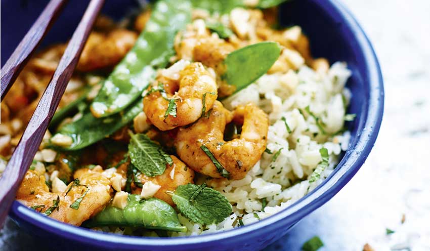 Colocar el arroz en una cacerola grande y cubrir con una cantidad generosa de agua. Anadir una pizca de sal y poner la cacerola a hervir. Bajar el fuego y cocinar a fuego lento durante 30 a 35 minutos (o según las instrucciones en el paquete) hasta que esté cocido. Mientras tanto, calentar la leche en una cacerola chica, o al microondas, sin dejar que hierva. Poner el azafrán en un plato pequeño resistente al calor o en un bol, cubrir con la leche caliente y dejar reposar para que suelte el aroma y color. Calentar el aceite en una cacerola grande. Agregar la cebolla y el pimiento rojo y cocinar a fuego lento, revolviendo con frequentai, durante 5 minutos. Agregar el cilantro molido, comino y la cúrcuma y continuar cocinando, revolviendo frecuentemente, hasta que las verduras estén tiernas, unos 5 minutos más, Anadir el caldo y dejar que hierva. Anadir los langostinos y cocinar a fuego lento durante 2 minutos. Retirar la sartén de fuego y dejar enfriar por unos minutos. Incorporar el queso untable poco a poco salsa caliente, y batir luego agregar la infusión de azafrán y leche y gran parte del cilantro fresco. Anandir sal, pimienta y jugo de limón al gusto. Colar el arroz y colocar con cuchara en cazuelas individuales. Verter la salsa sobre el arroz, espolvorear con el cilantro picado restante y servir con ensalada de pepino y cebolla.
