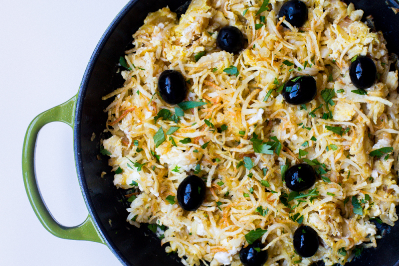 Retirar la piel de bacalao y dejar remojar en agua fría durante 24 horas, cambiando el agua más o menos 4 veces. Colocar una olla con suficiente agua y colocar el bacalao en piezas. Una vez que soltó el hervor, retirar el bacalao y reservar. Cocinar las papas en el agua, hasta que estén cocidas, pero no muy tiernas. Cortar las papas en rodajas. Cortar las cebollas y morrones en trozos grandes. Precalentar el horno a 180°C (moderado). Pintar una fuente de vidrio con aceite. Colocar los ingredientes en el siguiente orden: bacalao, pimentón, palmitos, tomates y cebolla. Rociar con aceite, espolvorear con orégano y las aceitunas. Llevar al horno durante 30 minutos.