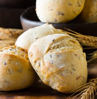En un bol, disolver la levadura en la levadura en el agua tibia. Dejar reposar por 10 minutos, hasta que empiece a formarse una espuma. En un bol grande, combinar la levadura con 450 cc e agua, 1/3 de la harina, sal, azúcar y aceite vegetal. Mezclar bien hasta que se integren bien todos los ingredientes. Incorporar el resto de la harina, de a poco batiendo bien después de cada adición. Una vez que la masa se separe del bol, colocarlas sobre una superficie enharinada, y amasar por 8 minutos, hasta que la masa esté suave y elástica. Aceitar ligeramente el bol, y colocar la masa y cubrirla bien con aceite. Cubrir con un repasador húmedo y dejar levar en un lugar tibio y seco, hasta que duplique su tamaño, más o menos, durante 1 hora. Dividir la masa en 2 partes. Estirar cada masa en un rectángulo de 23×30 cm, y enrollarlo como si fuese un pionono, a lo largo. Sellar los bordes y colocar la baguette con la junta hacia abajo sobre una placa para horno, previamente espolvoreada con harina de sémola, o polenta. Con un cuchillo filoso, hacer cortes diagonales en 3 lugares. Pintar con clara batida y espolvorear con semillas de lino. Tapar y dejar levar otros 30 minutos. Mientras tanto, precalentar el horno a 200°C (moderado/fuerte). Llevar al horno por 35 minutos, o hasta que se haya dorado.