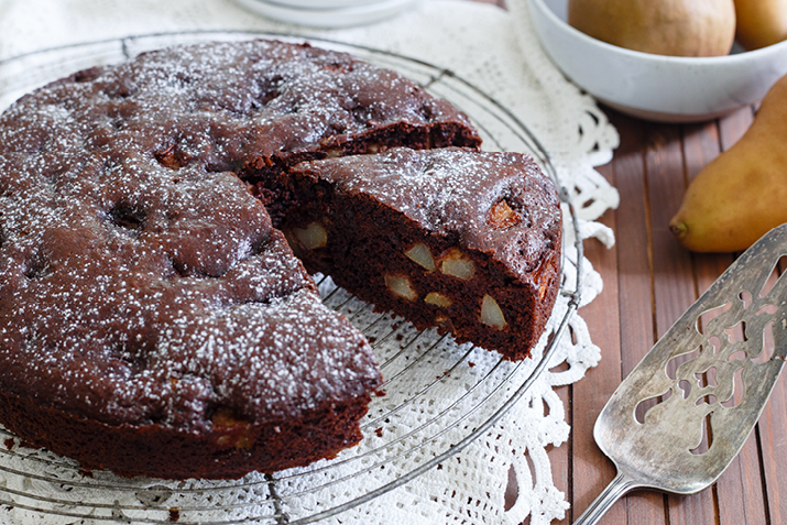 Precalentar el horno a 180°C (horno moderado). Enmantecar y enharinar una budinera alargada. En un bol, batir los huevos con el azúcar. Tamizar la harina y agregar junto con la mantequilla. Incorporar el chocolate picado y las peras. Mezclar todo sin batir de más y volcar en el molde. Emparejar y llevar al horno. Hornear 35 minutos o hasta que un palillo insertado en el centro salga limpio. Retirar u dejar enfriar por completo antes de servir.