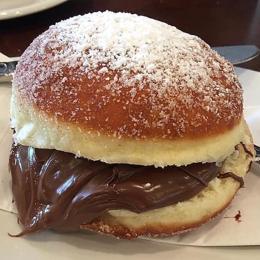 Mojar los sueños en la leche y luego en la mezcla de leche en polvo y azúcar. Cortar el sueño por la mitad y llenarlo con Nutella.