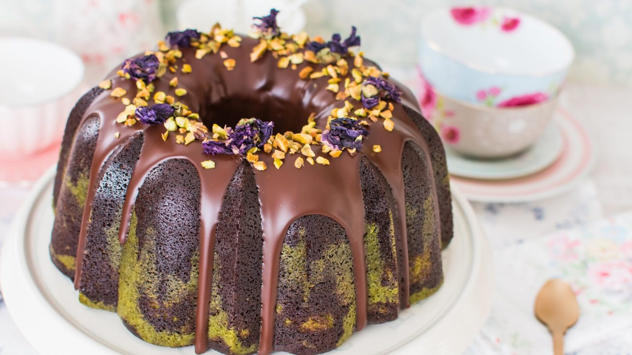 Para la mezcla de chocolate ponemos en un bol la mantequilla a temperatura ambiente junto al azúcar y lo batimos a velocidad alta durante 5 minutos. Ahora, añadiremos los huevos uno a uno. Añadimos el primer huevo y batimos hasta que se integre por completo antes de añadir el segundo. Una vez añadido, batimos hasta obtener una mezcla homogénea. Para darle un toque de sabor, añadimos el extracto de vainilla. Batimos un poquito para repartir bien el sabor. Y ahora sí ya tenemos la mezcla lista para agregar los ingredientes secos. Con un colador tamizaremos la harina, junto al cacao en polvo y la pizca de sal. También aprovechamos para añadir la levadura química. Damos unos golpecitos en el lateral del colador para tamizar todos los ingredientes juntos. Una vez tamizados, los batimos a velocidad baja. Cuando lo tengamos bien integrado, añadimos la leche poquito a poco mientras seguimos batiendo. En un minuto, ya tendremos la masa de chocolate terminada. La reservamos mientras hacemos la siguiente parte del bizcocho. Para la mezcla de té matcha empezamos batiendo la mantequilla con el azúcar. Después añadimos uno a uno los huevos previamente batidos. Agregamos el extracto de vainilla. Con la ayuda de un colador, tamizamos la harina, el té matcha, la sal y la levadura química. Damos unos golpecitos para tamizarlo todo junto y con la batidora a velocidad bajita, lo mezclamos hasta que se integren todo muy bien. Finalizamos la mezcla añadiendo la leche poquito a poco y batimos durante un minuto más hasta tener lista masa. Para hornear el bizcocho, utilizaremos un molde clásico de bund cake. Lo rociamos con spray antiadherente para luego desmoldar el bizcocho de manera muy fácil. Empezamos agregando la masa de chocolate en el fondo del molde. Esta masa es más densa que la de té matcha y por eso es mejor si la agregamos con un racionador de helados. Después añadimos por encima la mitad de la otra masa. Sobre ella, agregamos el resto de masa de chocolate y finalizamos con la masa que nos ha quedado de té matcha. Por ahora queda la mezcla verde por encima, pero por la densidad del chocolate ya veréis que después del horneado, el chocolate subirá a la superficie. Utilizamos una espátula para mezclar un poquito las dos masas. Así que vamos haciendo movimientos en forma de onda por todo el molde. Una vez listo, lo cubrimos con papel de aluminio y lo llevamos al horno precalentado a 180 ºC. El bizcocho estará listo en una hora y cuarto aproximadamente, pero antes de sacarlo del horno, os recomiendo pincharlo con un palito para comprobar que se ha cocinado por completo. Una vez listo, lo retiramos del horno y quitamos el papel de aluminio. Lo dejaremos reposar durante 10 minutos. Ahora, colocamos una rejilla encima y le damos la vuelta para desmoldarlo, pero antes de bañarlo con la ganache, lo dejaremos enfriar por completo. Para hacer la ganache ponemos el chocolate en un bol amplio y calentamos la nata en el microondas. Tiene que estar bien caliente, pero sin que llegue a hervir. Cuando la tengamos lista, la vertemos directamente sobre el chocolate y la dejamos reposar un minuto. Con unas varillas de mano removemos hasta que ambos ingredientes se integren. Añadimos la mantequilla, y como la mezcla aún está caliente, será muy sencillo incorporarla con el resto de ingredientes. Una vez esté todo bien integrado la dejaremos reposar para que adquiera cuerpo y consistencia. Para ello le ponemos papel film y la tapamos a piel. Y ahora sí, la dejamos reposar dos horas a temperatura ambiente para que se atempere. Para bañar el bizcocho, os aconsejo poner una bandeja con papel vegetal debajo de la rejilla, así el chocolate caerá sobre el papel y lo podréis aprovechar mucho mejor. Antes de que endurezca la ganache, le ponemos un punto crujiente por encima. En este caso he triturado unos pistachos que van muy acorde con el verde del té matcha. Finalizamos la decoración con unas flores de malva secas. Son totalmente comestibles y le darán al bundt cake de chocolate y té matcha un toque de color lila en la parte superior muy elegante.