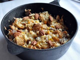 Precalentar el horno a 180°C (moderado). Cortar el pan rodajas de 2,5 cm de grosor. Tostar ligeramente y untar con mantequilla por ambos lados. Colocar las tortillas en la base de una fuente de vidrio apta para horno dejando que los bordes se superpongan ligeramente. En una cacerola, colocar 5 tazas de agua, 3 tazas de azùcar moreno y la melaza. Incorporar la canela en rama, la ralladura de naranja, y 1 pizca de sal. Hervir hasta lograr un almíbar. Acomodar las rodajas de pan sobre las tortillas en la fuente separàdos un poco porque se van a expandir. Cubrir con capas de nueces, ciruelas, pasas, manì y mix de frutas secas picadas. Distribuir encima rodajas de queso fresco y rociar con el almíbar lentamente para que todas las capas se humedezcan poco a poco. Llevar al horno y cocinar 30 minutos. Servir tibio.