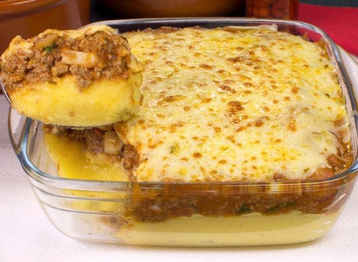 Para la salsa, calienta una olla con el aceite de oliva, en fuego medio, y freír la cebolla y el ajo hasta dorar. Agrega la carne y rehogar hasta secar toda la agua. Añada el tomate, la salsa y cocine durante 10 minutos. Junte a la aceituna, el palmito, el olor verde, la sal, la pimienta y la cocina durante 5 minutos. Apaga y reserva Para la polenta, mezcle el maíz con la mitad del agua hasta disolver. Reserve Calienta una olla con el agua restante, el caldo de verduras y la mantequilla hasta hervir y disolver el caldo. Agrega el maíz disuelto y cocine durante 5 minutos, revolviendo. Transfiera a un refractario medio engrasado, cubra con la salsa y espolvorear con la mozzarella. Lleve al horno alto, precalentado, por 5 minutos para queso Retire y sirva