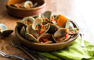 Cazuela de almejas en salsa de tomates y chorizo colorado