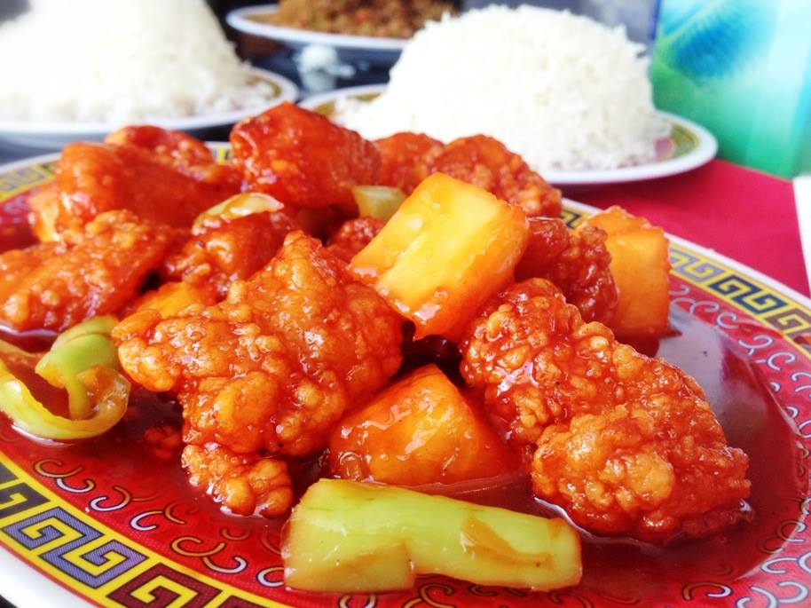 Salpimentamos los trozos de carne y rebozamos en harina, huevo batido y de nuevo harina. Freímos en una sartén con poco aceite hasta que doren y se forme una capa con el rebozado. Retiramos y reservamos. Diluye la fécula de maíz en el agua hasta que quede una pasta. Añade el ketchup, el vino y la salsa de soja, el azúcar, el jugo de piña y el vinagre, y bate mezclando todo bien. Rehogamos en aceite en una cazuela la cebolla y el pimiento unos minutos hasta que estén algo blandos pero al dente. Removemos la mezcla agridulce que hemos hecho (tiene que estar bien integrada) y la agregamos a la sartén hasta que empiece a hervir. Entonces ponemos la carne y cocinamos todo a fuego medio-bajo durante 5 minutos. Cuando queden un par de minutos ponemos la piña y damos unas vueltas. Servimos con arroz blanco.