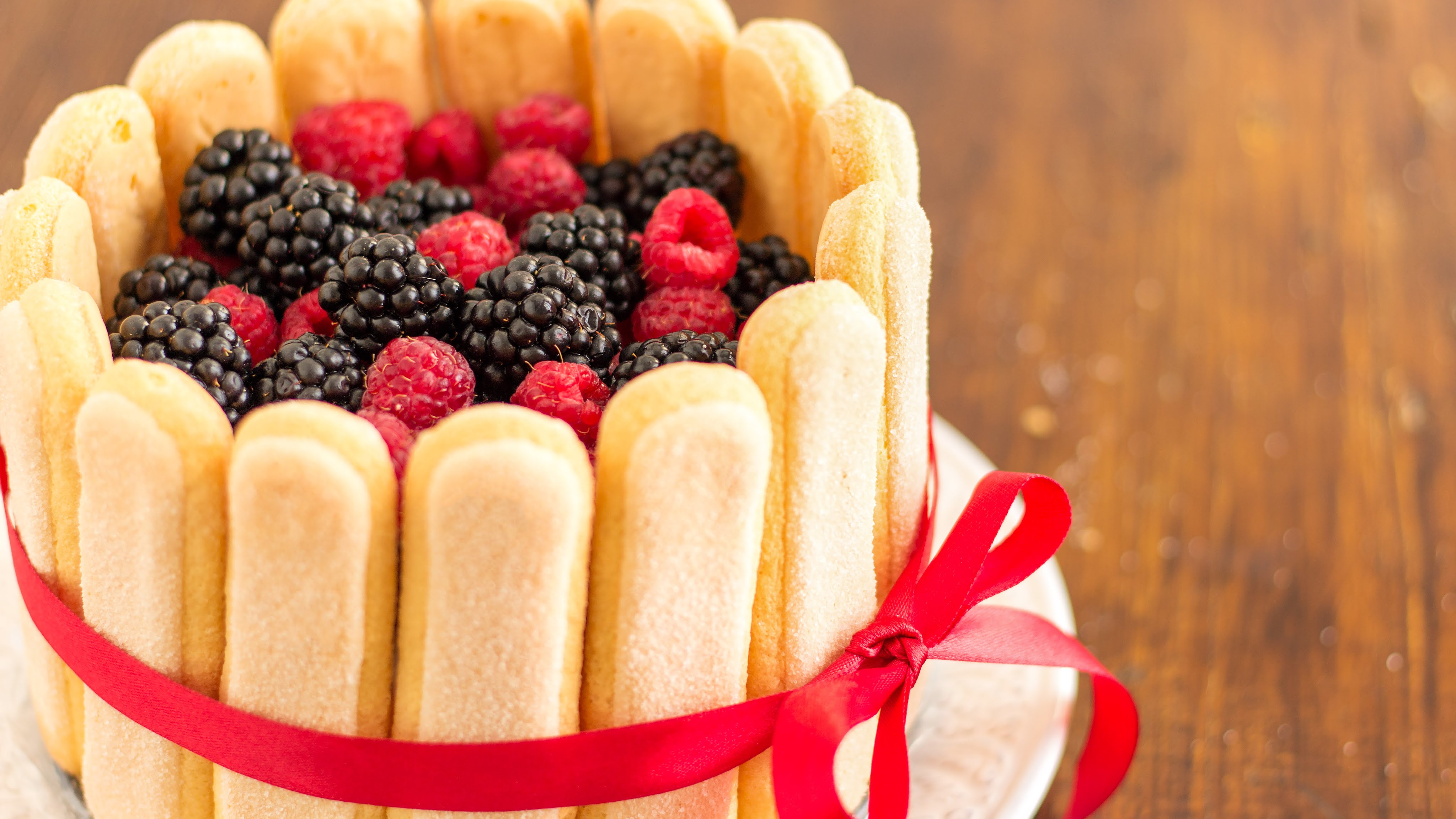 Para hacer esta tarta, es recomendable utilizar el molde desmontable de Lékué 18 centímetros de diámetro. Con este molde, podremos desmoldar la tarta sin problemas y dejarla directamente el plato de cerámica. Preparamos las bizcotelas, cortándolas un poquito para dejar un extremo plano y que puedan aguantarse de pie en el molde. Para cubrir este molde necesitamos recortar 23 bizcotelas. Para hacer la mousse utilizamos fruta del bosque confitada. Es muy cómodo utilizar este formato, pero también podéis confitar vosotros mismos la fruta o utilizar mermeladas naturales. Vertemos el contenido del primer bote y para que la mousse no nos quede líquida, escurrimos el contenido del segundo bote, para únicamente agregar la fruta. Ahora, con una batidora de mano, trituramos la fruta confitada para hacer un puré. De esta manera, tendremos la fruta repartida en la mousse de manera uniforme. Una vez triturada, la reservamos para más adelante. En otro bol, ponemos agua bien fría y vamos introduciendo una a una las láminas de gelatina, asegurándonos de que queden totalmente cubiertas por el agua. Las dejaremos reposar así durante 10 minutos. Ahora vertemos la nata bien fría en la batidora. Con el globo batimos a velocidad alta durante 2 minutos. Pasados los 2 minutos, añadimos el azúcar en forma de lluvia y dejamos que se bata 1 minuto más. Ahora, calentamos la leche en el microondas. Una vez caliente, escurrimos cada una de las láminas de gelatina y las introducimos en la leche. En unos segundos las láminas quedarán completamente disuelta. Agregamos una cucharada del puré que habíamos reservado en la leche para enfriarla un poquito. Una vez disuelta la fruta, vertemos la leche en el resto del puré y con una cuchara removemos bien para que se integren todos los ingredientes. Antes de mezclar la nata con el puré, igualaremos un poco las temperaturas. Así que añadimos una buena cucharada de nata en el puré. Mezclamos bien hasta integrarla por completo, así seguro que no se cortará la mousse cuando la mezclemos. Cuando esté bien integrada, vertemos todo el contenido sobre la nata y con una lengua repostera, lo incorporamos haciendo movimientos envolventes. Una vez integrada, la dejamos a un lado mientras preparamos el molde. Para montar la tarta empezamos mojando el lado más liso de las bizcotelas y las colocamos alrededor del molde, teniendo en cuenta que el lado que hemos mojado debe ir en la parte interior de la tarta. Así, dejamos el lado rugoso y rústico hacía fuera. Poco a poco vamos cubriendo con las bizcotelas todo el molde. Si se os dificulta un poco mantenerlas de pie, podéis poner bizcotelas totalmente empapadas en leche, en la base de la tarta. Así, aguantarán con más facilidad las bizcotelas de los bordes. Cuando terminemos de cubrir todo el molde, rellenamos la base. Una vez cubierta la base, ponemos la mitad de la mousse de frutos del bosque por encima. También podéis hacer la mousse de otro sabor o utilizar crema pastelera. Una vez puesta, con la misma cuchara, la aplanamos un poquito y la ajustamos a los bordes. Ahora, volvemos a poner otra capa de bizcotelas completamente empapadas en leche. Aprovechad trocitos pequeños para cubrir todos los huecos posibles. Así, cuando cortemos la tarta, tendremos una capa homogénea de bizcotelas. Finalmente añadimos el resto de la mousse por encima y aplanamos la superficie. Llevamos a la nevera durante 6 horas. Para decorar la parte superior de la tarta utilizamos fresas, moras y grosellas naturales. También le añadimos frambuesa y mora deshidratada para darle un toque diferente. Y decoramos con unas hojas de menta y azúcar glass espolvoreada con ayuda de un colador. Desmoldamos la tarta con cuidado y le damos el toque final con una cinta.