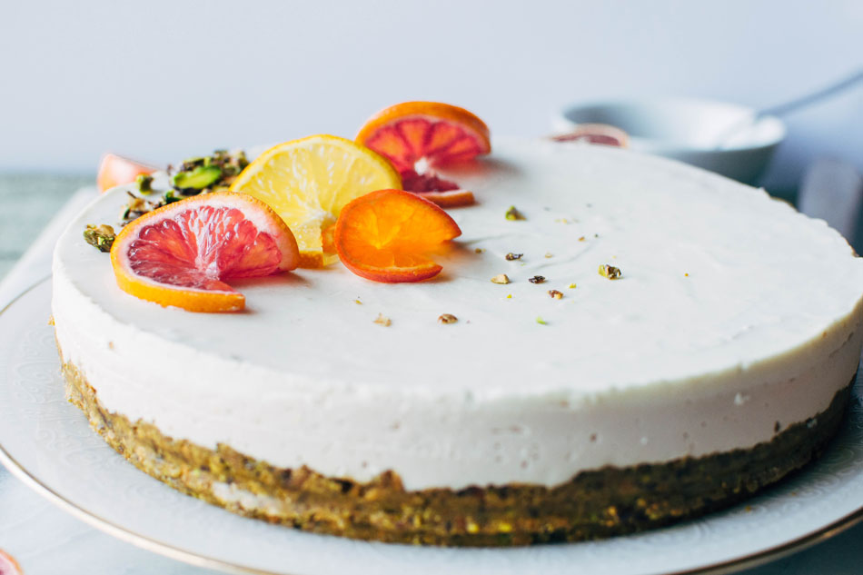 Bate en una batidora eléctrica el queso crema, el cardamomo, azúcar, ralladura de limón y de naranja, jugo de limón y naranja, bate hasta que la mezcla esté cremosa, agrega los huevos uno por uno, agrega la leche condensada, la crema y bate 5 minutos más, retira de la batidora eléctrica. Reparte el relleno sobre la base con la galleta molida, hornea a banomaria 2 horas o hasta que al insertar un palillo de madera éste salga limpio, retira del horno y deja enfriar por completo, desmolda y sirve.