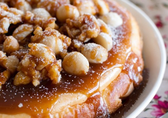 Bate en una batidora eléctrica el queso crema hasta que esponje, agrega el azúcar, mantequilla, los huevos uno por uno, la cucharadita de vainilla y bate hasta que esté suave, retira y agrega las nueces picadas en forma envolvente. Vierte el relleno sobre la base con la galleta molida, hornea a banomaria 2 horas o hasta que al insertar un palillo de madera éste salga limpio, retira del horno y deja enfriar por completo, desmolda y sirve.