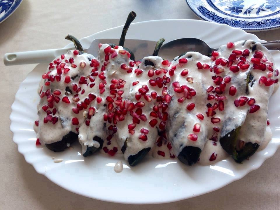 Se cortan todas las frutas en cubitos. Se tuestan las almendras y los piñones. Se pican el ajo y la cebolla, y se acitronan en un poco de aceite vegetal. Se agrega la carne y se sazona con sal y pimienta. Cuando esté bien cocida la carne, se reserva. En la misma sartén, se agrega un poco más de aceite y se fríen las frutas, empezando por el plátano. Cuando las frutas empiecen a soltar jugo, se retiran del fuego y se agregan a la carne, al igual que las almendras, los piñones y las pasas. Se revuelve todo y se deja cocinar tres minutos más a fuego medio. Se retira del fuego y se deja enfriar. Se licuan los quesos, la crema, la leche y las nueces en la licuadora. Para servir, se vierte la crema en el plato, se colocan los chiles encima, se rellenan con la carne y se cubre con la granada y nueces picadas.