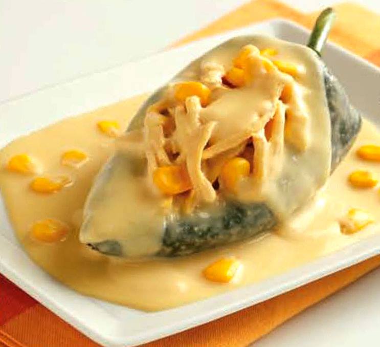 La pechuga de pollo la ponemos a cocer en un poco de agua con sal y pimienta, una vez que esté cocida la desmenuzamos en trozos. Los chiles poblanos los vamos a asar en la estufa, después los pelamos y quitamos sus semillas. Ahora vamos a hacer la salsa de elote, para esto vamos a licuar la leche evaporada con las 2 cucharaditas de consomé de pollo, 2 dientes de ajo, 1/4 de cebolla, fécula de maíz, 1/4 taza de agua y 1 taza de granos de elote. Ya licuada esta salsa la vamos a calentar en una sartén moviendo constantemente hasta que espese un poco, una vez que espese agregamos el resto de granos de elote. Luego, rellenamos cada uno de los chiles con el pollo, bañamos con la salsa caliente y acompañamos con arroz.