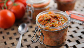 Retirar los cubitos de los tomates y picarlos bien finitos. Mezclar todos los ingredientes en una olla de hierro y dejar que hiervan. Bajar la temperatura y dejar cocinar destapado por 90 minutos. Sazonar a gusto. Colocar en frascos esterilizados y cerrarlos herméticamente. Darlos vuelta y dejar reposar hasta que estén fríos.