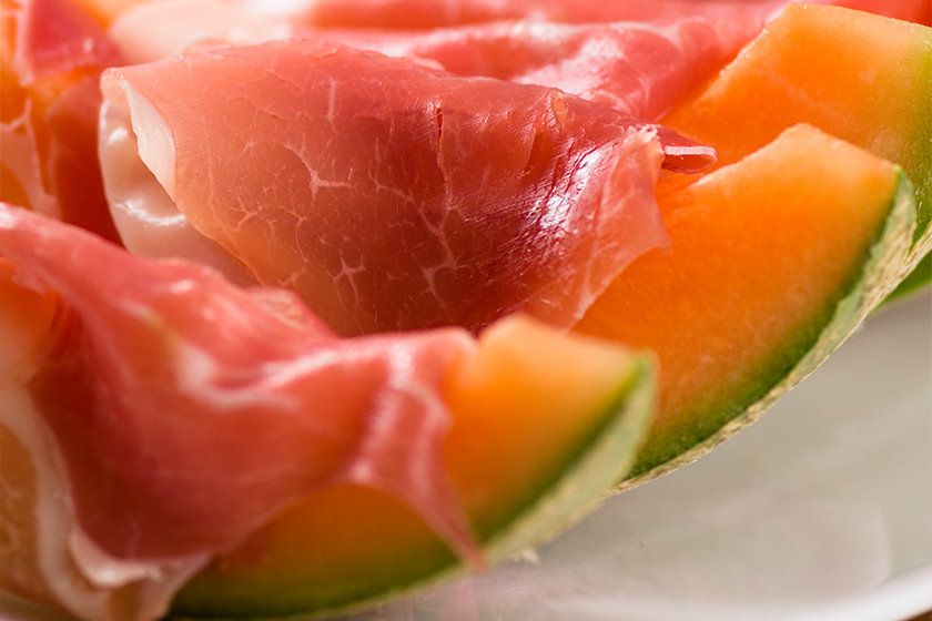 Corte el melón por la mitad, retire las semillas con una cuchara, pele el melón y córtelo en tajadas finas. Distribuya las tajadas de melón y las lonchas de jamón de forma decorativa sobre los platos. Escalde los tomates, pélelos y quíteles los pedúnculos. Retire las semillas y corte los tomates en dados pequeños. Lave las hierbas aromáticas, sacúdales el agua, arranque las hojas de albahaca de los tallos y píquelas junto con el perejil. Mezcle el aceite de oliva con el vinagre, los tomates y las hierbas aromáticas formando una marinada. Salpimiente al gusto. Vierta la marinada sobre el jamón y sirva el plato.