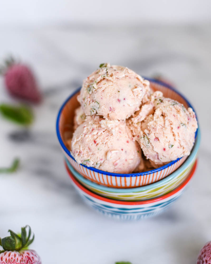 En un bol, mezclar las fresas y la menta. En una cacerola pequeña, combinar el agua y el azúcar. Hacer hervir, reducir el fuego a medio y cocinar a fuego lento unos 3 minutos o hasta que la mezcla adquiera una consistencia de almíbar ligero. Dejar enfriar 5 minutos. Rociar el almíbar sobre las frutillas y la menta, y mezclar suavemente. Dividir las frutillas en cuatro copas o compoteras. Cubrir con una bocha de helado y una cucharada de crema batida. Decorar con una hoja de menta.