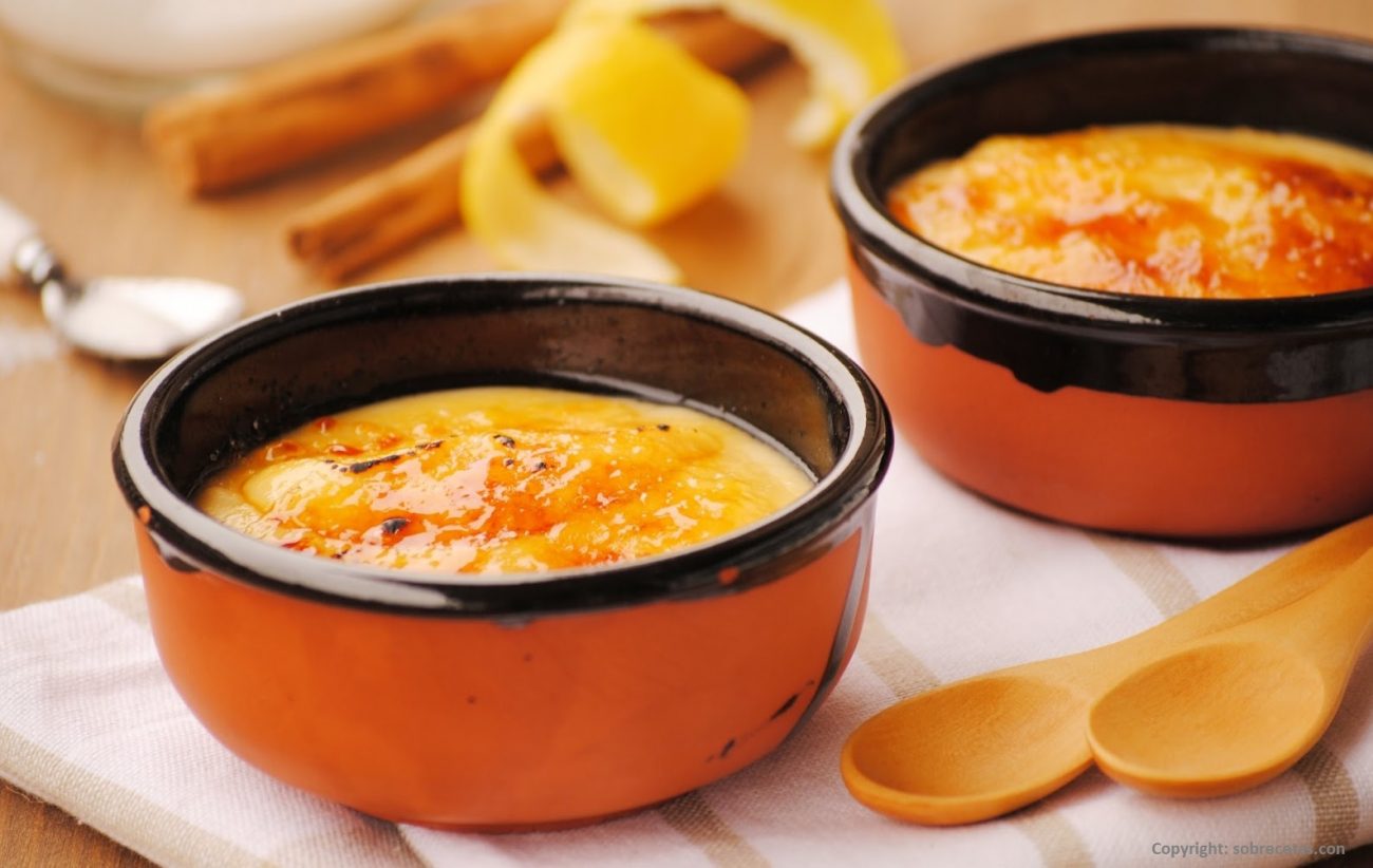 En un bol batir las yemas de los huevos, anadir el almidón y una taza de leche fría. Se remueve muy bien, procurando que no se hagan grumos. Poner la leche restante en un cazo, junto con él azúcar, la canela y la piel del limón. Cuando arranque a hervir, retirar el cazo del fuego. Quitar las pieles de limón y canela y poner la mezclar que hemos hecho con los huevos el almidón y la leche, batiendo bien con las varillas muy lentamente. Poner el cazo otra vez al fuego, sin dejar de remover y cuando empiece a hervir, retirar el cazo del fuego. Poner la crema cocida en cazuelas individuales (acostumbran a ser barro), y dejar enfriar a temperatura ambiente. Llevar a enfriar en la nevera tapadas con film transparente. Finalmente, antes espolvorear la crema con el azúcar restante y quemar con la pala de quemar, que es lo tradicional ò (con soplete, que es más moderno). Dejar enfriar un poco para que el azúcar se endurezca y haga una capa de caramelo. Acompañar con un barquillo.