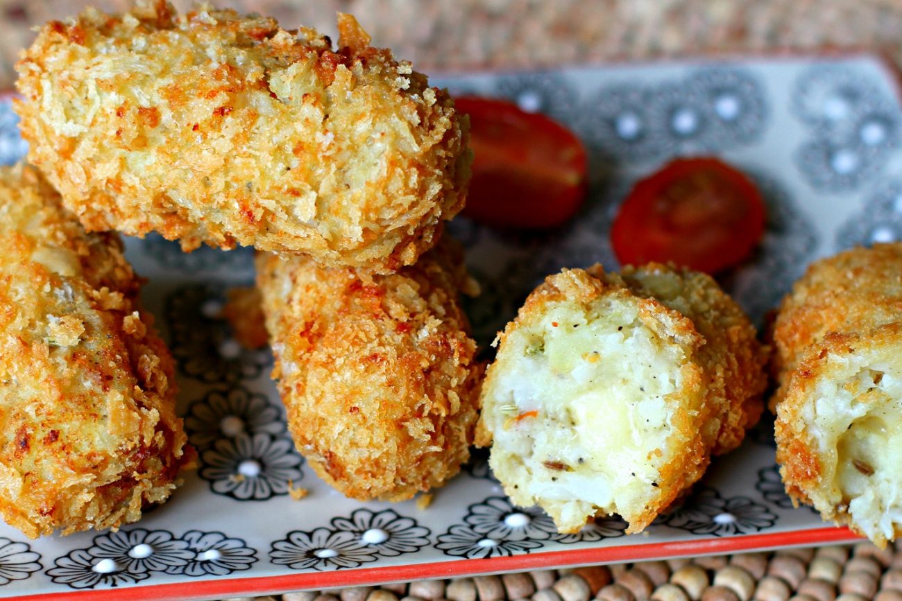 La salsa: dorar los ajíes sobre el aceite, agregar los otros condimentos y luego los tomates, mezclar y cocinar a fuego lento. Las croquetas: mientras tanto, hervir las patatas con piel y coliflor. Cuando estén bien cocidas, pelar las patatas y deshacerlas mezcladas con la coliflor. A este purè, agregar los demás ingredientes (también si se quiere variar, agregar queso fresco) y luego darle la forma de bolitas de unos 3 cm de diámetro. Dorar las bolitas friéndolas en abundante aceite. Mezclar la salsa con el yogur y verter la mezcla sobre las bolitas recién doradas. Servir de inmediato, porque en contacto con la salsa tienden a deshacerse.