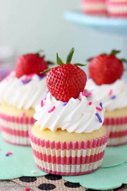 Cortar la manteca fría en cubitos y mezclar con el azúcar impalpable, la harina tamizada y el polvo para hornear. Trabajar con las manos, hasta formar una mezcla arenosa con grumos. Lavar las frutillas, quitar los cabitos y cortar en láminas gruesas. Colocar un poco de la preparación de manteca en cada pirotín, presionando para formar una base. Arriba, ubicar las frutillas formando una capa. Por encima colocar la otra parte de masa, llenar muy bien, ya que durante la cocción las frutillas pierden mucho líquido y tienden a hundirse. Llevar al horno precalentado, 190°C, hasta que se doren. Dejar entibiar. Para el frosting helado, limpiar las frutillas y agregarles el azúcar y el jugo de limón. Dejar reposar unas horas a temperatura ambiente para que suelten su jugo. Procesar ligeramente las frutillas, así quedan algunos trozos de las mismas. Mezclar con el yogurt y agregarle la crema batida a punto chantilly. Llevar al freezer por 1 hora. Cuando se empiezan a congelar los bordes, retirar y mezclar enérgicamente, usando batidor de mano o una batidora eléctrica para romper los cristales. Continuar revolviendo cada media hora, hasta que el helado se congele totalmente. Dependiendo del recipiente que utilicemos y de la cantidad de helado, puede llevar unas 3 horas. Servir los cupcakes tibios con una bocha de helado encima, decorar con frutillas fileteadas y hojas de menta fresca.