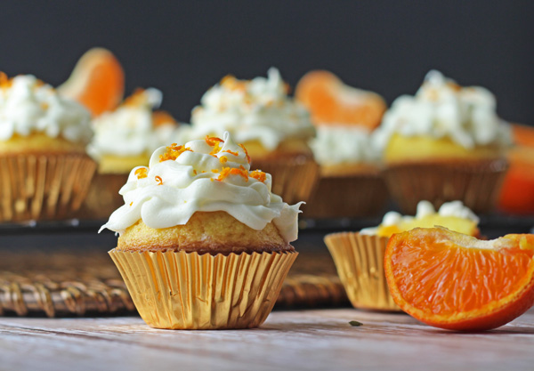 Precalentar el horno a 180°C. Mezclar el azúcar con la harina y la sal tamizadas. Lavar bien 2 de las mandarinas con su cáscara, partirlas por la mitad horizontalmente y quitarles las semillas, colocarlas en la procesadora o licuadora, y agregar la tercera mandarina sin piel. Procesar hasta que resulte un puré líquido y homogéneo. Añadir el aceite y los huevos, y procesar nuevamente. Agregar esta preparación a la mezcla de los ingredientes secos y batir con batidora eléctrica. Colocar en los pirotines y llevar a horno moderado, 180°C, por espacio de 20 a 25 minutos. Dejar que se doren bien en la superficie, ya que se les hace una costra muy rica. Dejar enfriar. Para el glasé, tamizar el azúcar impalpable. Colocar las claras en el bol de la batidora junto con el jugo colado de mandarina y la mitad del azúcar. Comenzar a batir a velocidad máxima unos 5 minutos, o hasta que la preparación quede bien blanca y cremosa. Añadir el restante de azúcar en forma de lluvia y continuar batiendo hasta que la preparación forme picos bien firmes. Agregar unas gotas de colorante naranja y revolver muy suavemente con una cuchara hasta lograr la tonalidad deseada. Decorar los cupcakes con el glasé de mandarina, utilizando el revés de una cuchara para formar picos. Espolvorear con caramelos de mandarina o naranja picados groseramente.