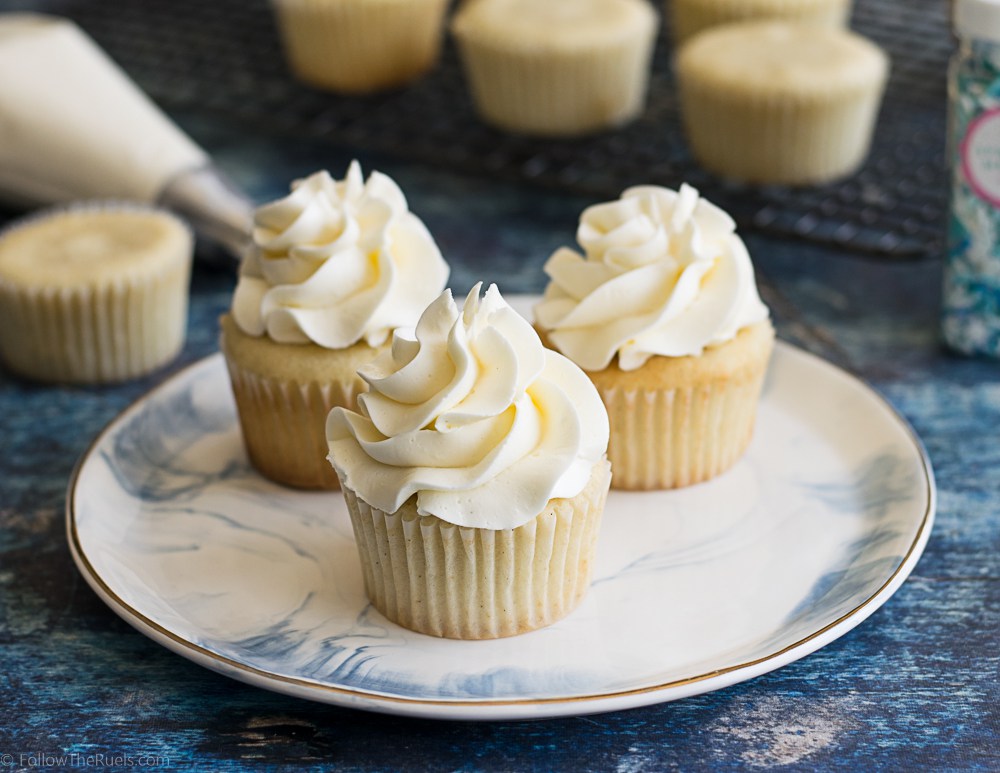 Precalentamos el horno a 190°C. En un bol batimos la mantequilla con el azúcar con la ayuda de las varillas eléctricas, hasta que adquieran una consistencia cremosa y suave. Anadimos los huevos y el extracto de vainilla y seguimos mezclando. En otro bol tamizamos la harina y la mezclamos bien con la levadura. Incorporamos a la mezcla anterior y batimos muy bien. Distribuimos la masa en las cápsulas de papel, más o menos llenándolas hasta 2/3 de las mismas y horneamos durante 15 minutos, o hasta que veamos que están firmes en la parte superior central. Dejamos enfriar cinco minutos en el molde y terminamos de enfriar por completo en una rejilla. Una vez fríos se pueden decorar con cualquier frosting o buttercream.
