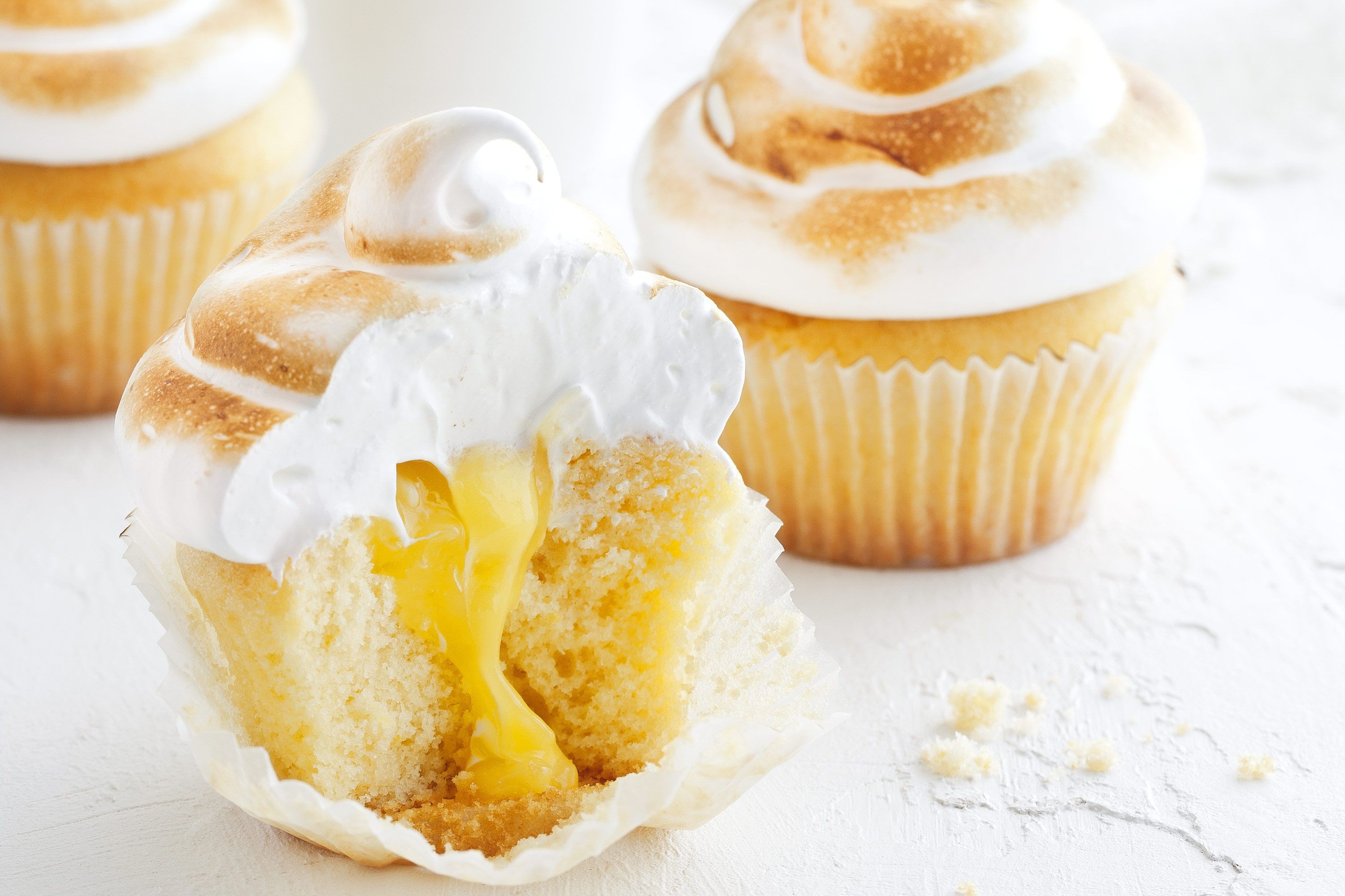 Precalentar el horno a 180°C (moderado). Enmantecar y enharinar un molde para cupcakes. En un bol mediano, mezclar el azúcar y la mantequilla hosta lograr una crema suave. Incorporar los huevos de a uno, y por ùltimo la esencia de vainilla. Mezclar la harina y el polvo para hornear, y agregar a la mezcla de crema. Por ùltimo, agregar la leche hasta que la mezcla esté suave. Verter en el molde preparado, hasta 1/3 del borde superior. Llevar al horno por 20 a 25 minutos, y estará listos justo cuando al introducir un palillo este salga limpio. Dejar enfriar en una rejilla. Para preparar el merengue, batir las claras a nieve con batidora eléctrica. Agregar de a una las cucharadas de azúcar para que no se bajen las claras. El punto se alcanza cuando al dar vuelta el bol las claras permanecen firmes sin deslizarse. Agregar la pizca de sal. Reservar. Para preparar el relleno colocar en una olla todos los ingredientes menos la mantequilla, habiendo disuelto previamente la fécula de maíz en el agua fría. Cocinar a fuego mediano hasta punto hervor revolviendo siempre con el batidor de alambre. Retirar del fuego e ir incorporando la mantequilla de a pequeños pedazos y revolver. Dejar entibiar. Una vez fríos los cupcakes, esparcir una buena cucharada de relleno sobre ellos y luego decorar con el merengue con un copete o con manga con boquilla rizada. Llevar a la heladera pero servir el mismo dia.