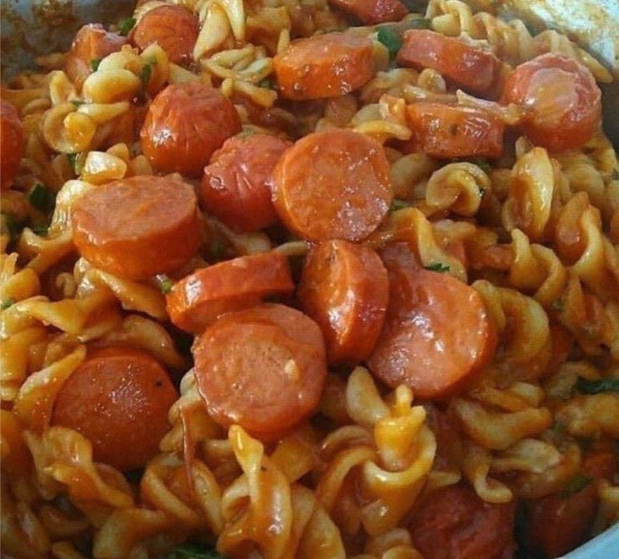 Es súper fácil de hacer. Rehoga ajo y cebolla en un poquito de aceite, luego coloca la salchicha, deja dorar, pone salsa de tomate y un poquito de agua. Junta tomate picadillo y travieso del reino si tiene, deja dar una espesada en fuego medio y coloca la pasta pre cocida en punto más durito o según las instrucciones del embalaje, mezcla, mezcla, mezcla, mezcla. Apágalo cuando llegue al punto que te gusta y finaliza con olor verde. Disfruta!