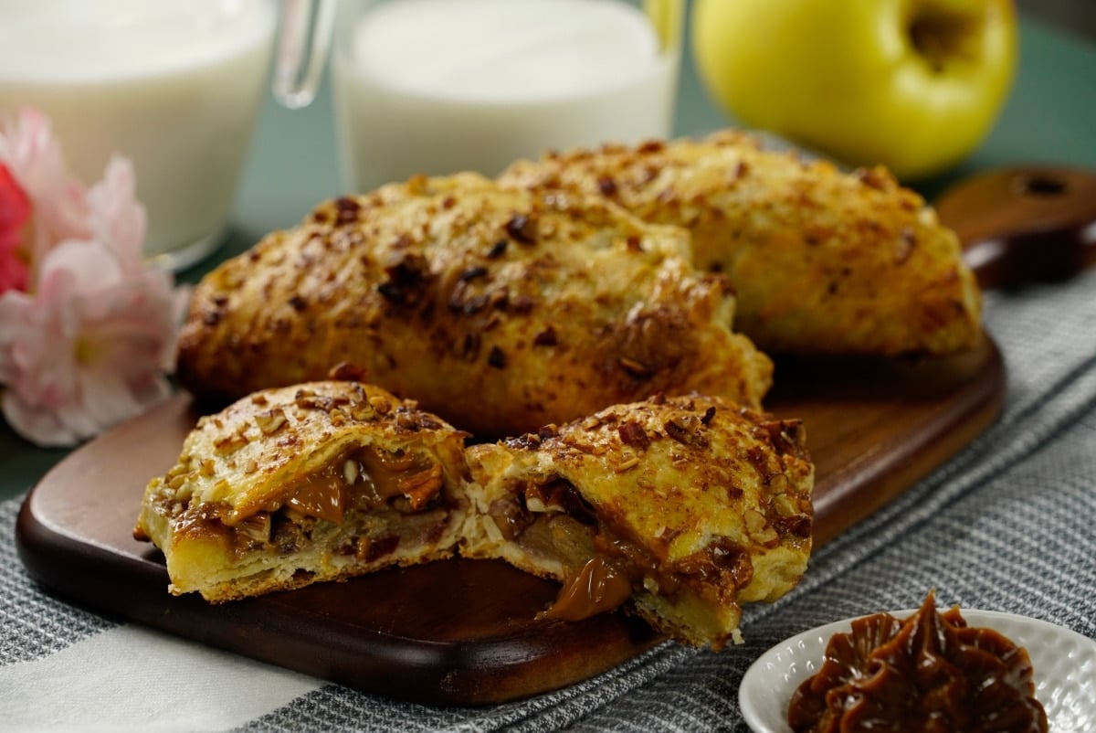 Rellena los discos de hojaldre con las manzanas y un poco de dulce de leche, con ayuda de tus manos realiza dobleces para cerrar las empanadas. Coloca en una charola, barniza con huevo y espolvorea con nueces. Hornea durante 20 minutos o hasta que estén doradas. Sirve con leche o café. Sobre una canasta, acompañadas de café. Puedes dejar macerar las manzanas toda la noche para que absorban más sabor. Utiliza manzanas Granny Smith para que el relleno sea más ácido y tenga un mejor contraste con el dulce de leche.