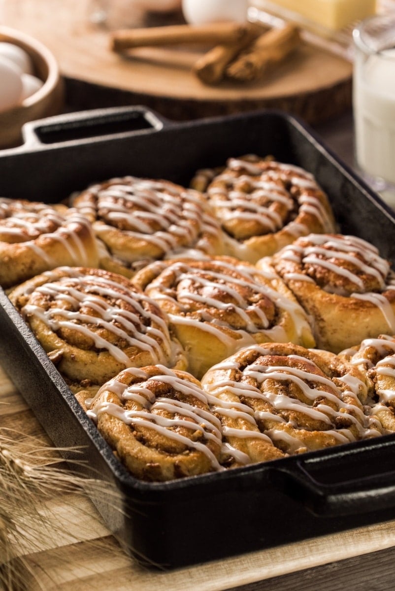 En un cuenco de batidora agrega la harina, el azúcar, el huevo, la sal, la leche con levadura y bate hasta tener una consistencia homogénea. Agrega la mantequilla y continúa amasando hasta integrar. Coloca en un cuenco previamente engrasado y fermenta por una hora o hasta que duplique su volumen. Precalienta el horno a 180°C. Para el relleno, mezcla el azúcar mascabado con la mantequilla y la canela. Sobre una superficie enharinada, extiende la masa con ayuda de un rodillo, agrega el relleno, las nueces y enrolla, con ayuda de un cuchillo corta los roles de 2cm de grosor. Coloca los roles sobre un refractario, doblando la punta del rol hacia abajo para conservar la forma. Fermenta por 20 minutos más. Barniza con huevo y hornea los roles por 20 minutos. Enfría. Para el glaseado, mezcla el azúcar glass con la leche, vierte sobre los roles de canela, decora con nueces. Sirve acompañados de un vaso leche. Sobre el refractario, acompañados de una jarra de leche fresca. Coloca la masa en el lugar más cálido de tu casa para acelerar la fermentación. Es importante que, al momento de colocar el rol, dobles las puntas hacía abajo para que no se abran y pierdan la forma. Si utilizas levadura fresca son 27 gramos. También puedes cortar los roles con ayuda de un hilo, para no aplastarlos demasiado.