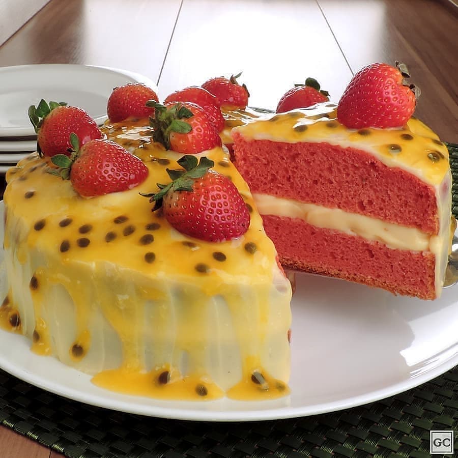 Bate los huevos hasta que doblen su volumen. Añade la mantequilla, el azúcar, la leche, la gelatina, la harina, la levadura y bátelo hasta que esté homogéneo. Viértalo en un molde de 24 centímetros de diámetro, engrasado y enharinado, y hornee en un horno precalentado y medio durante 30 minutos o hasta que esté dorado. Espera a enfriarse, sin forma y cortada por la mitad, en dirección horizontal. Reserva. Para la mousse, derretir el chocolate al baño maría y mezclarlo con el jugo de maracuyá y la crema hasta que esté cremoso. Para el jarabe, lleva todos los ingredientes a fuego lento hasta que estén ligeramente espesos. Apágalo y deja que se enfríe. Para armar, coloque un disco de masa en un plato, extienda 1/3 de la mousse de maracuyá encima y coloque el otro disco de masa. Cubra toda la torta con la mousse de maracuyá restante, decore con el jarabe de maracuyá y las fresas. Refrigere durante 2 horas antes de servir.