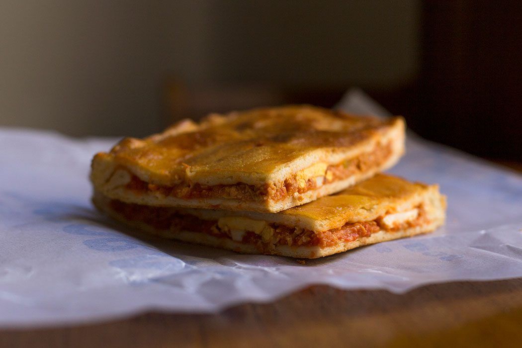 Precalentar el horno a 200°C (fuerte). Para la masa: Colocar todos los ingredientes en una procesadora y mezclar hasta que se forme un bollo que se separe de las paredes del bol. Dividir la masa en dos bollos iguales y dejar reposar unos 30 minutos en la heladera. Luego estirar con un palote en una superficie enharinada y cubrir el primer disco una tartera previamente enmantecada. Para el relleno: En un sartén grande, rehogar la cebolla, el morròn y ajo en una cucharada de aceite por 5 minutos hasta que estén tiernos. Anadir el atún y las olivas descarozadas y picadas. Salpimentar a gusto y condimentar con el pimentón. Por último, agregar la patata en cubos, bajar el fuego y cocinar por 7 a 10 minutos más hasta que la papa esté tierna. Reservar y enfriar por 20 minutos como mínimo antes de rellenar la tarta. Para el armado: Una vez frío el relleno, cubrir la masa estirada con el relleno y esparcirlo homogéneamente por la masa. Cubrir con el segundo disco de masa estirado u cerrar los bordes con un repulgue simple. Pintar con huevo batido. Llevar al horno por 30 minutos hasta que se haya dorado la masa. Dejar enfriar por 10 minutos antes de cortar y servir.