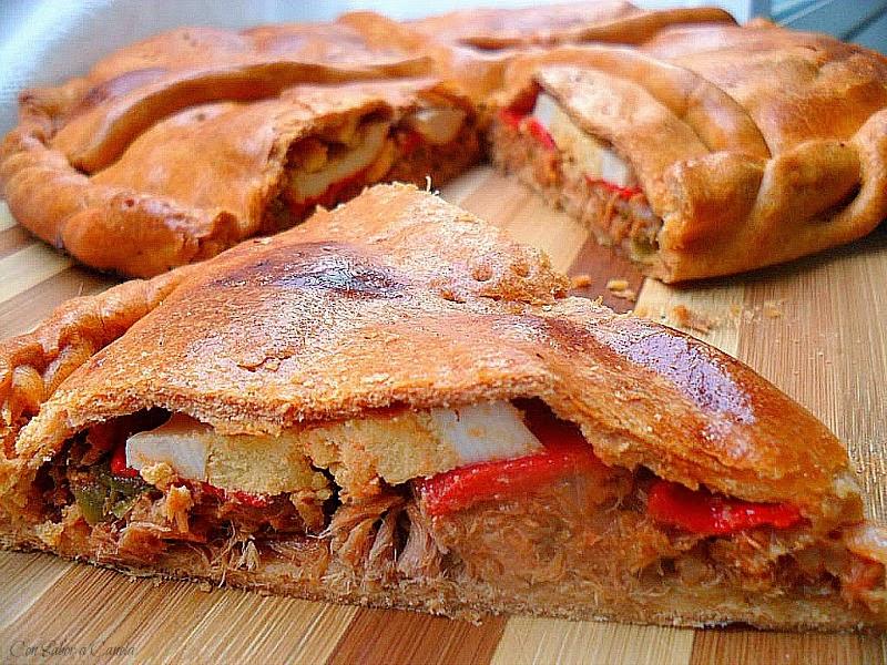 Precalentar el horno a 200°C (moderado/fuerte). Calentar el aceite de oliva en una sartén grande. Rehogar la cebolla hasta que esté transparente. Agregar los marrones y cocinar por 5 minutos. Incorporar los tomates, y condimentar con sal. Tapar y cocinar por 10 minutos. Anadir el atún y el huevo duro. Retirar del fuego y reservar. Forrar una placa para horno con papel mantequilla. Colar el relleno de atún, dejando 2 cm en el borde. Doblar los bordes sobre el relleno. Cubrir con el segundo disco de masa. Juntar los bordes y pinchar con un tenedor. Usar el resto de la masa para decorar sobre la empanada gallega. Pintar con huevo batido. Llevar al horno por 20 minutos, o hasta que se haya dorado. Dejar enfriar antes de cortar y servir.