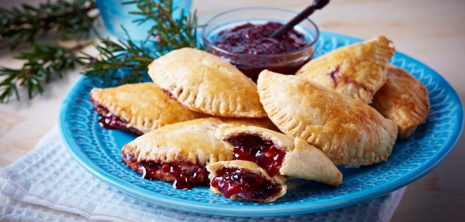 Cernir la harina con el polvo para hornear, agregar la mantequilla, yemas, crema y azúcar. Mezclar con una raspa en forma arenosa. ahora con las manos integrar hasta formar una masa. Dejar reposar la masa tapada en una bolsa de plástico en el refrigerador por 15 minutos. Extender sobre tu mesa de trabajo previamente enharinada dejándola de medio centímetro de grosor. Cortar círculos del mismo tamaño con un cortador redondo. Barnizar la orilla con el huevo, colocar un poco de queso y mermelada en el centro de cada círculo, doblar y presionar con un tenedor para que quede bien cerrada cada empanada. Colocarlas en una charola con papel encerado. Barnizar con el resto del huevo. Hornear a 180°C por 15 minutos o hasta que estén ligeramente doradas.