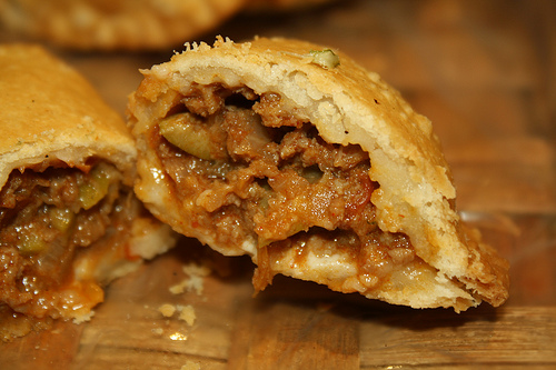 Derretir la margarina en una sartén y rehogar las cebollas picadas. Agregar el pimentòn, pàprika, y salpimentar al gusto. Una vez cocidas, reservar las cebollas. En la misma sartén, cocinar la carne picada a cuchillo y sazonar con sal y pimienta al gusto, junto con el vinagre y el comino. Cocinar por uno 10 minutos a fuego mediano, hasta que la carne se haya cocido. Agregar las cebollas a la preparación de la carne, y cocinar por otros 5 a 7 minutos. Dejar enfriar por lo menos por 30 minutos. Es importante ya que resultará mucho más fácil poder rellenar las empanadas. Separar las tapas de empanadas, y colocar una cucharada grande de carne en el medio. Agregar unos pedacitos de huevo picado, pasas de uva y aceitunas picadas. Remojar el borde de la masa con el dedo mojado en agua para sellarlas bien y que el relleno no se escape durante la cocción. Doblar la tapa, quedando formada la medialuna. Sellar bien los bordes con un tenedor. Pintarlas con huevo batido. Precalentar el horno a 180°C (moderado). Colocar las empanadas en una asadura cubierta con papel mantequilla. Llevar las empanadas al horno durante 20 a 30 minutos, hasta que la masa esté dorada.