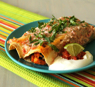Precalentar el horno a 200°C (fuerte). Enmantecar una fuente para horno y mesa. Mezclar las patatas con el comino, chile en polvo, sal y Ketchup. Colocar todo en la fuente y llevar al horno. Cocinar 20 0 25 minutos hasta que las patatas estén tiernas. Mientras tanto, hervir los tomates verdes y la cebolla en suficiente agua como para cubrirlos. Retirar del fuego y esperar a que se enfríen. Una vez que se han enfriado, licuar con la mitad del cilantro hasta lograr una salsa homogénea. Freír ligeramente las tortillas, una por una, en un poco de aceite. No dejar que se doren ya que deben quedar blandas y no crocantes. Mezclar las patatas con los porotos, la mitad del queso y la mitad de cilantro restante. Rellenar las tortillas con esta mezcla y enrollarlas. Colocarlas boca abajo en una fuente para horno y mesa enmantecada. Rociar con la salsa y espolvorear el resto de queso sobre la salsa. Hornear durante 20 minutos o hasta que empiecen a burbujear. Servir caliente.