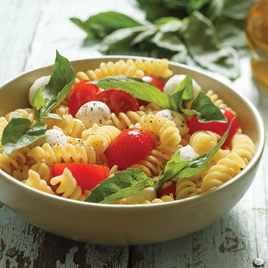 Cortar los tomates Cherry por la mitad y dejarlos escurrir en un colador durante 20 minutos. Llevar a ebullición abundante agua hirviendo con sal para cocer la pasta. Anadir los espárragos y dejar que cuezan hasta que estén tiernos (aproximadamente 5 a 7 minutos). Sacarlos del agua con una espumadera, dejarlos escurrir en un colador y pasarlos bajo el chorro de agua fría para evitar que se cuezan demasiado y para que se conserven un bonito color verde. Escurrir bien y reservar. Volver a llevar a ebullición el agua y cocer la pasta hasta que esté al dente. Pasarla bajo el chorro de agua fría para se que enfríe rápidamente y escurrir muy bien. En una ensaladera grande mezclar la pasta, los espárragos y el resto de los ingredientes. Salpimentar y mezclar hasta que la pasta esté bien cubierta por el aliño. Servir a temperatura ambiente.