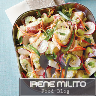 Poner a cocer en abundante agua las patatas hasta que estén tiernas. Escurrirlas, pelarlas, y trocearlas en dados. Disponerlas en una fuente, cortar los pimientos, los huevos duros pelados y los tomates, reservando los tomates cereza para adornar, mezclando todo muy cuidosamente con la mayonesa y la zanahoria rallada para no desmoronar las patatas. Adornar con zanahoria rallada por encima, las cebollitas, los tomates cereza y las aceitunas. Servir en la misma fuente o en recipientes individuales. Para dar más consistencia al plato se puede anadir atún en conserva escurrido.