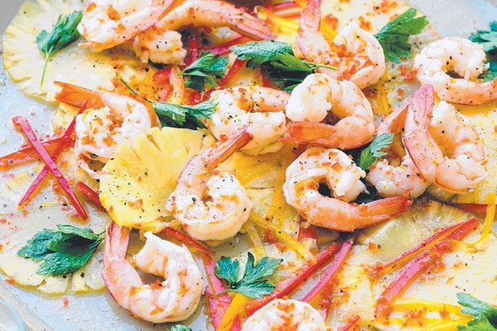 Pelar la pina y cortar en rodajas. Calcular media rodaja por persona. Cortar las rodajas en trocitos y apartar. Lavar muy bien la lechuga y cortar en tiras muy finas. Apartar. Pelar las quisquillas hervidas. Cortar las barritas de marisco en trozos. Mezclar la mayonesa con el ketchup en 4 partes de mayonesa por una parte de ketchup. Así se obtiene la salsa rosa para el preparado final. Optar por utilizar platos individuales (los ideas son copas grandes). Poner en cada uno primero una base de lechuga cortada y exprimir un poco de limón encima. Luego anadir el marisco, la pina y sazonar con pimienta negra y un poco de sal. Finalmente anadir la salsa rosa encima. Servir los antes posible. Adornar cada copa con una rodaja de limón.
