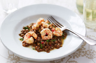 En primer lugar, colocar en el fondo de una fuente o plato unas hojas limpias de lechuga, el tomate en gajos y las judías verdes. Después, sazonar al gusto y anadir las lentejas. A continuación, decorar la ensalada con las colas de langostinos, peladas y partidas por la mitad, y las cebolletas en juliana. Por último, aliñar con aceite, vinagre y sal, y servir.