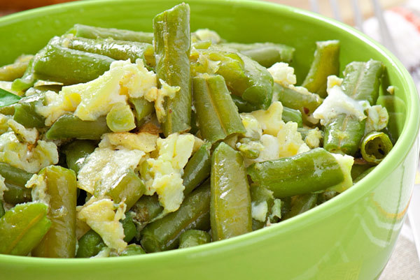 Cocer las judías verdes en agua caliente con sal y un chorro de aceite de oliva durante 40 minutos. Una vez cocidas, escurrir y reservar dejando enfriar. Montar el plato con las patatas cortadas en lonchas. En el centro poner las judías verdes. Alrededor, situar el tomate cortado en lonchas finas y las hojas de endibia. Alinar con sal y mayonesa aligerada con un poco de caldo de la cocción de las judías. También se puede alinar con aceite y vinagre.