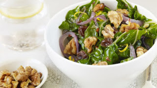 Precalentar el horno a 200°C (moderado/fuerte). Colocar las cebollas cortadas en una asadera. Rociar con 2 cucharadas de aceite de oliva y espolvorear con azúcar. Llevar al horno por 30 minutos. Dar vuelta las cebollas y dejar que se caramelicen bien, y cocinar más o menos por otros 30 minutos. Dejar enfriar. Pasar las cebollas per la procesadora, anadir el resto del aceite, el caldo de pollo y el vinagre, hasta lograr una mezcla bien suave y homogénea. Salpimentar al gusto. Tapar y llevar a la heladera hasta que esté bien frío. En una ensaladera grande, colocar las hojas verdes, las nueces y la cebolla morada. Anadir el aderezo y mezclar y mezclar bien. Para servir, rociar por encima con algunas nueces.