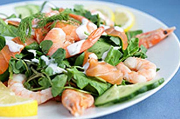 Cocemos las gambas un par de minutos por un lado y el pescado 5 minutos por otro lado. Los mejillones se abren al vapor, reservamos el pescado y el marisco. Pelamos y troceamos la patata, troceamos las zanahorias, y las hervimos junto con las patatas troceadas durante 15 minutos. Posteriormente se escurre, y la anadimos los guisantes previamente lavados. Con la mayonesa, el kètchup y el coñac realizamos una salsa rosa clarita. Aderezamos con ella la ensaladilla. Troceamos el pescado reservando 4 medallones de rape para la guarnición. Cortamos la lechuga en juliana y la mezclamos con el pescado. Extendemos la ensaladilla en una fuente, la cubrimos con el pescado y la lechuga, y lo cubrimos con la salsa rosa. Picamos los huevos duros lo ponemos por encima. Decoraremos con las gambas, mejillones, pepinillos y medallones de rape previamente reservados.