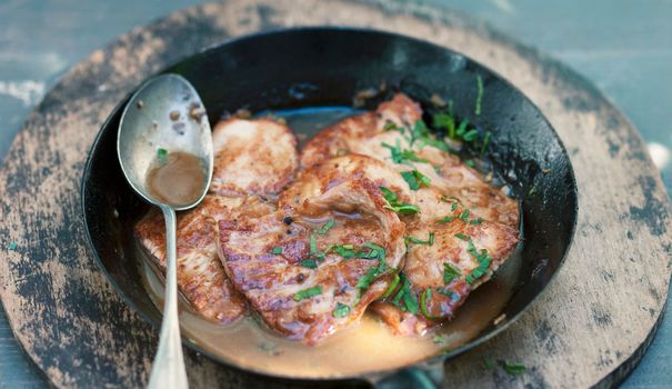 Para obtener el mejor sabor en esta receta es cocinar la carne a temperatura ambiente, para ello debemos sacar la carne de la nevera una hora antes de cocinarla. Salpimentamos por los dos lados y reservamos. Comenzamos pasando los escalopines en una sartén o cazuela baja por aceite de oliva virgen extra Abril Selección, vuelta y vuelta, no más de un minuto por cada lado, no queremos que nos queden duros como piedras. La carne debe quedar jugosa, además se acabará de hacer en la salsa que vamos a preparar a continuación. Retiramos de la sartén a un plato y continuamos con la receta. Preparamos la salsa de vinagre balsámico, para ello pelamos los dos dientes de ajo y los echamos a la sartén con el mismo aceite donde hemos hecho la carne. Lo mejor para tener el sabor del ajo es machacarlo o en un mortero o con un machaca ajos como podéis ver en el vídeo de Terra, así no os encontraréis trozos grandes a la hora de comer, aunque esto va al gusto del personal. Una vez que pillen un tono dorado, echamos el perejil cortado finamente y juntamos con el ajo. Añadimos el vinagre balsámico y el caldo de carne o agua. Dejamos que reduzca durante 5 minutos a fuego fuerte hasta que se forme una salsa espesa como si fuese jarabe. Apagamos la sartén y ya fuera del fuego añadimos la carne y el jugo que haya soltado. Pasamos vuelta y vuelta para que se empape del sabor de la salsa, con que reposeen esa salsa un minuto es más que suficiente. En Italia, se suelen añadir a la salsa unas bayas de enebro, algo de canela en rama y unos clavos de olor para aromatizarla un poco más. Incluso le iría muy bien el toque de una cucharada de miel. Esta salsa es perfecta para barbacoas o para carnes a la parrilla. Podéis guardarla en un bote hermético en la nevera durante unos días (3 ó 4, no más). Ya podemos emplatar, recomiendo añadir una hojita de perejil en la presentación para darle un toque de color al plato. Lo podemos acompañar de unas patatas fritas o de una buena ensalada de tomate o de escarola, os lo dejo a vuestra elección. No os olvidéis de un trozo de pan para mojar la salsa ¡está gloriosa!