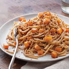 Marina el tofu en 2 cucharadas de soya. Calienta suficiente agua con sal, la cebolla y un chorrito de aceite; cuando hierva, agrega el espagueti hasta que esté cocido. Escurre reservando media taza de agua. En la misma olla agrega el agua que reservaste, la crema de cacahuate, el resto de la salsa de soya, el vinagre y azúcar; mezcla hasta que se integre y quede como una salsa. Agrega los espaguetis hasta que se bañen de la salsa. Calienta agua con sal y hierve los chícharos y las zanahorias unos minutos; escurre y agrega a los espaguetis, sazona con sal y pimienta. Caliente en una sartén 2 cucharadas de aceite de oliva, fríe el tofu hasta que se dore por ambos lados. Sirve el espagueti en los platos, agrega el tofu y los cacahuates picados.