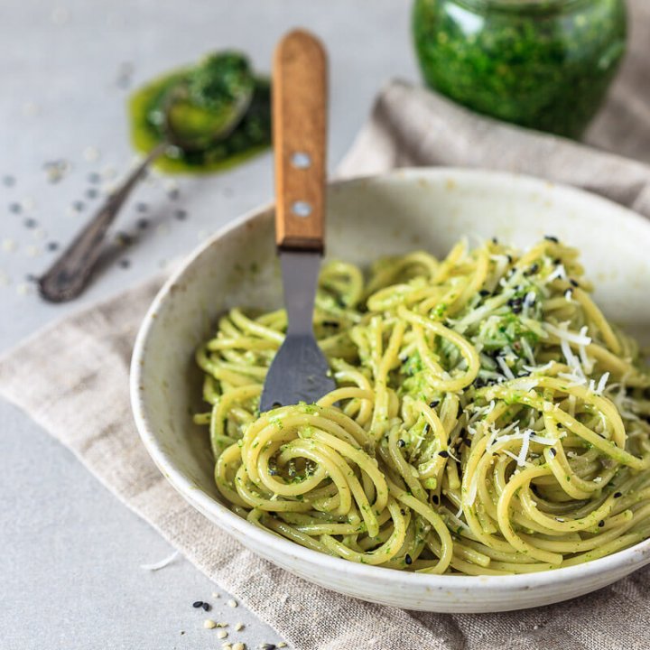 Poner a hervir una olla con agua con sola. Una vez que hirvió, colocar los espaguetis y cocinar de acuerdo a las instrucciones del paquete. Mientras tanto, lavar las hojas de perejil y albahaca y colocarlas en la licuadora. Pelar el ajo, y retirar el centro verde. Incorporar el ajo a las hojas, junto con las nueces, 3 cucharadas de aceite, 1 pizca de sal y 1 cucharada de agua. Licuar todo bien hasta que se forme una salsa bien homogénea (pesto). Si queda demasiado espeso, agregar un chorrito más de aceite. Rectificar la sazón si fuese necesario. Colar los fideos y servir de inmediato con abundante pesto y queso rallado al gusto.