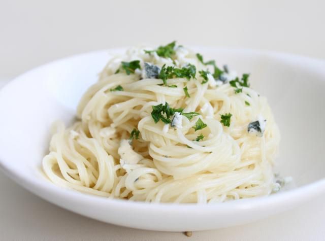 Cocinar los fideos de acuerdo a las instrucciones del paquete. Colar y reservar. Calentar el aceite en un sartén grande a fuego medio. Saltear la cebolla durante 10 minutos, revolviendo frecuentemente. Agregar el ajo y cocinar por 2 minutos. Retirar del fuego y agregar el vinagre balsámico. En un bol grande, mezclar la pasta, la cebolla y el queso azul. Revolver bien hasta que el queso se haya derretido. Servir de inmediato.