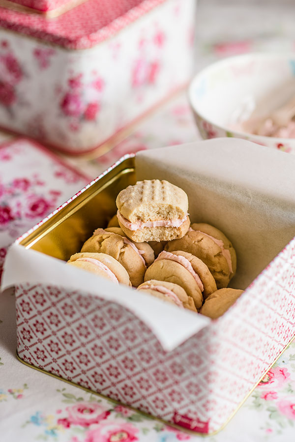 Estas galletas rellenas sin gluten se deshacen en la boca, y gustan a todos, celiacos o no, porque la harina de arroz les da una consistencia fina y muy agradable, frágil y quebradiza, y un sabor estupendo. El relleno de estas galletas es crema de mantequilla aromatizada con alguna jalea o pulpa de frutas, pero igualmente se pueden rellenar con lemon curd, buttercream básico, crema de chocolate o lo que se nos ocurra.