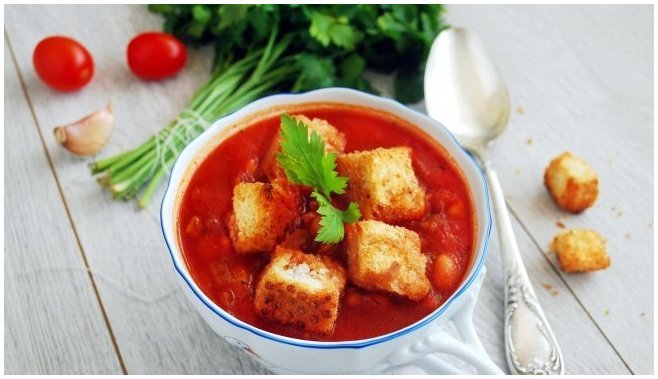 Precalentar el horno a 180°C (moderado). Cortar un diente de ajo a la mitad y frotar los lados cortados en el interior de un bol grande y en ambos lados de las rebanadas de pan. Con la mano, cortar el pan en cubos de 2 cm. Colocar en el tazón y cubrir con aceite vegetal en aerosol. Espolvorear con 1/2 cucharadita de pimienta. Revolver para cubrir; pasar a una badeja. Hornear los croutones hasta que estén dorados. Dejar enfriar. Procesar la cebolla y el resto del ajo en un procesador o una licuadora hasta que estén bien picados. Agregar la mitad de los tomates con su jugo y hacer un purè. Agregar el pan molido, el perejil, el vinagre, el aceite y el resto de la pimienta. Procesar hasta que se mezclen. Verter en un bol grande, que no sea metálico. Cortar el resto de los tomates. Incorporarlos a la mezcla con la mitad de los pepinos cortados y la mitad de los pimientos verdes y rojos. Enfriar 1 hora. Colocar en platos hondos y agregar el resto de los pepinos, de los pimientos verdes y rojos, y los croutones. Servir frio.